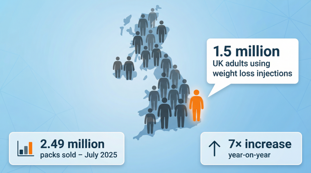 In March 2025, approximately 1.5 million UK citizens were actively using weight loss injections. By July, sales of Mounjaro and Wegovy hit a record 2.49 million packs—a sevenfold increase from the year before.